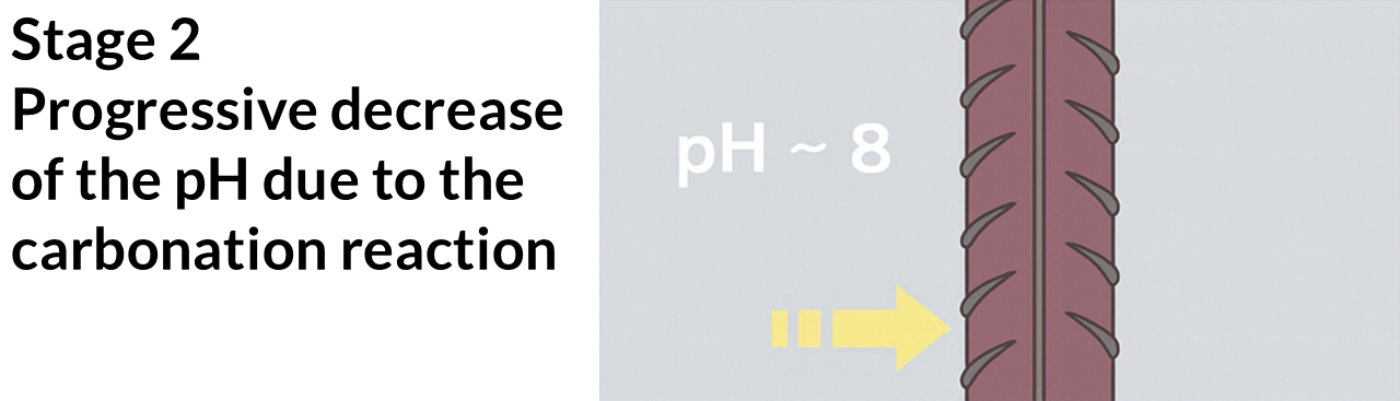 - When carbon dioxide (CO₂) from the air penetrates the concrete (through pores and microcracks), it reacts with calcium hydroxide: Ca(OH)₂ + CO₂ → CaCO₃ + H₂O